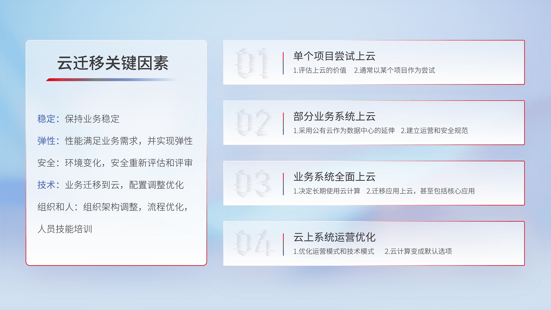 结合实际业务,,,从规划设计、、、、云平台选型、、、、云原生改造、、、、数据迁移、、、集成交付,,,,迁移全过程为客户识别最佳上云路径,,做好风险识别管理,,设计网络架构、、、身份权限、、、、安全审计合规、、、、操作审计、、、、日志审计、、、、监控告警策略、、、、多站点容灾设计等,,,对云上基础设施进行整体规划,,,,提升IT治理水平,,,以满足弹性、、高可用、、、、高性能的需求。。。