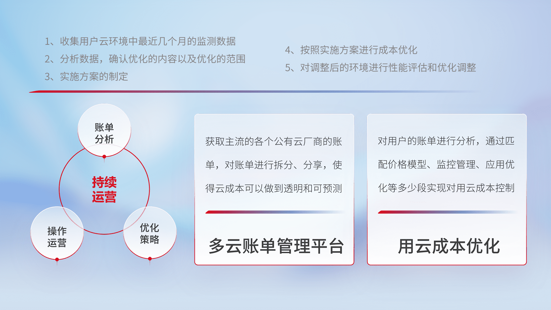 通过多云纳管,,,以统一的资源数据模型把客户的云资源进行抽象和封装,,,进而实现对多云资源的统一操作,,,保障云资源管理的可靠性、、稳定性与可用性。。。量身定制化运维内容,,配置、、、开发运维、、、补丁管理、、、备份、、、监控、、、、认证和访问管理、、审计和日常巡检等,,保障在用云过程中的可靠度,,,稳定度以及高可用率。。