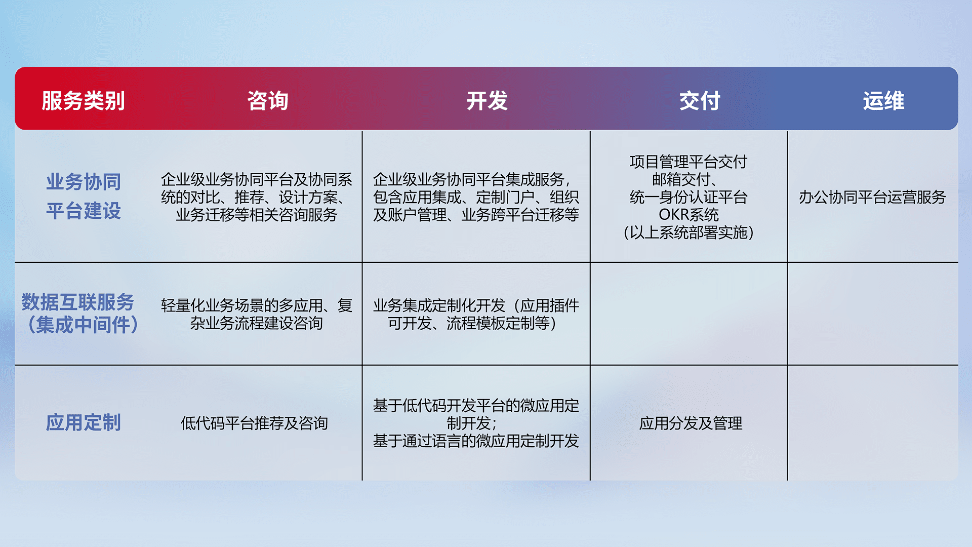 针对钉钉、、、企微、、、、IDaas等平台级产品提供产品的规划、、、、方案、、、交付、、、定制化开发等服务,,,,实现如统一协同办公、、、智能客户服务、、、混合会议管理、、、智能数据查询、、、等业务场景,,实现数字化转型。。。